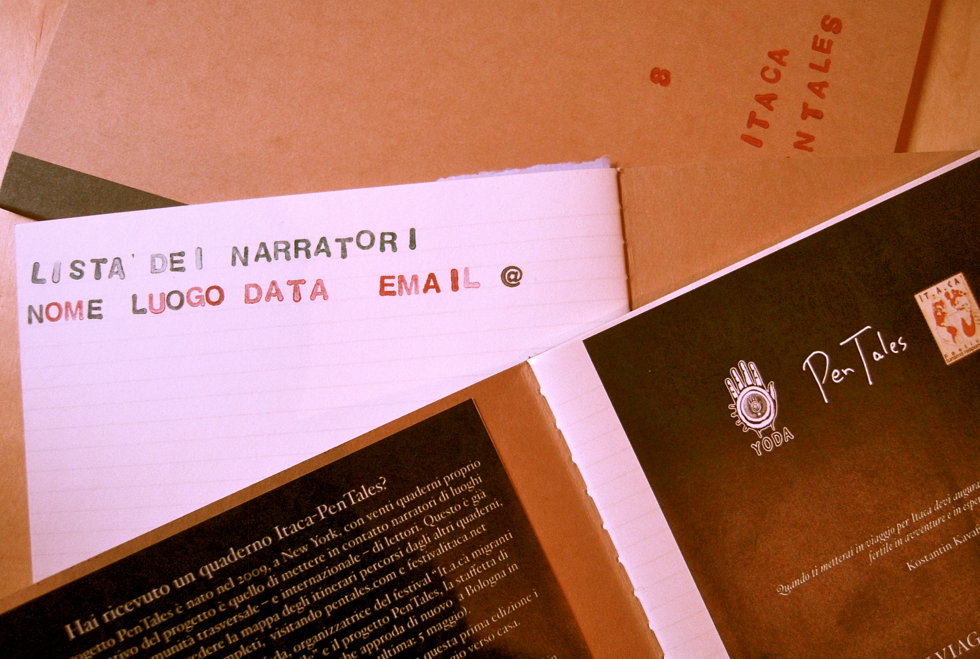 Per aiutarti, per la prima edizione italiana di It.a.cà_PenTales, una consegna tematica, il titolo: Itaca, in viaggio verso casa. (Dove la casa è anche ideale e metaforica, approdo di ogni peregrinazione eroica o umana, luogo interiore e simbolico, meta fisica, patria, isola sconosciuta). La staffetta dei quaderni It.a.cà_PenTales approderà a Bologna dal 22 al 28 maggio, durante l’evento It.a.cà migranti e viaggiatori: festival del Turismo Responsabile.