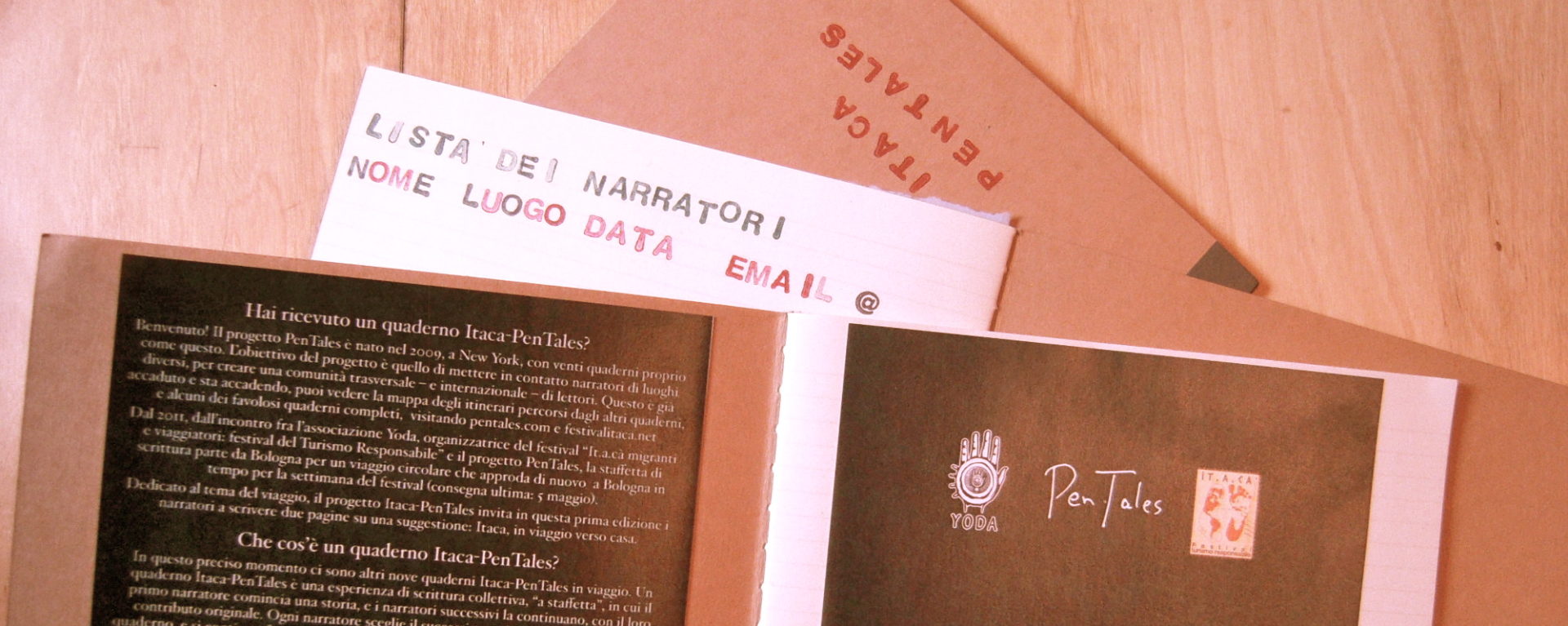 Dal 2011, dall’incontro fra la redazione di Yoda, organizzatrice del festival “It.a.cà migranti e viaggiatori: festival del Turismo Responsabile” e PenTales, la staffetta di scrittura parte da Bologna per un viaggio circolare che approda finalmente anche a Bologna. Dedicato al tema del viaggio, il progetto It.a.cà_PenTales invita i narratori a scrivere due pagine su una suggestione:”Itaca, in viaggio verso casa”.