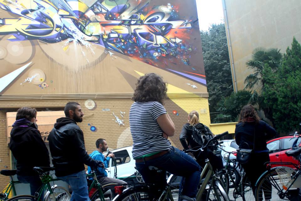 Così il gruppo Salvaiciclisti ha pensato di organizzare un percorso guidato, con la collaborazione di Claudio Musso, per ripercorrere tutta la mappa delle opere in bicicletta. Domenica 20 Ottobre 2013: 40 persone si sono ritrovate sotto il pezzo di Phase II, nei pressi del Quartiere San Donato, per fare insieme i 12 chilometri che collegano le 13 opere. Bambini e ragazzi, scampanellando sotto il cielo plumbeo di una domenica autunnale, sono partiti per conoscere la propria città. I risultati sono stati sorprendenti.