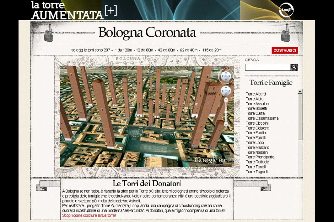 Si presenta con lo slogan: Questo Natale, regala una Torre! Si riapre la sfida per la torre più alta di Bologna! Sono decine le nuovi torri sorte a Bologna, grazie al curioso progetto di Loop_Torre Aumentata. La creativa realtà bolognese ha lanciato un nuovo progetto di riqualificazione del patrimonio culturale locale, dopo il successo del cartone animato Piccionaia