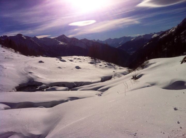 Abbiamo alloggiato la prima notte a Bionaz, a quota 1600m, presso la Maison Constance, dove la sorridente Loredana ha recuperato il vecchio stabile di famiglia ricavandoci un incantevole B&B affacciato sul lago Lexert, da cui si diramano 5 km di pista nazionale di biathlon (era in arrivo la nazionale francese per gli allenamenti in vista delle olimpiadi di Sochi). La ricca colazione di Loredana ti offre l’energia giusta per affrontare la ciaspolata lungo il sentiero direzione Berrer, alpeggio a 2.100m, dove si gode di una vista a 360°.