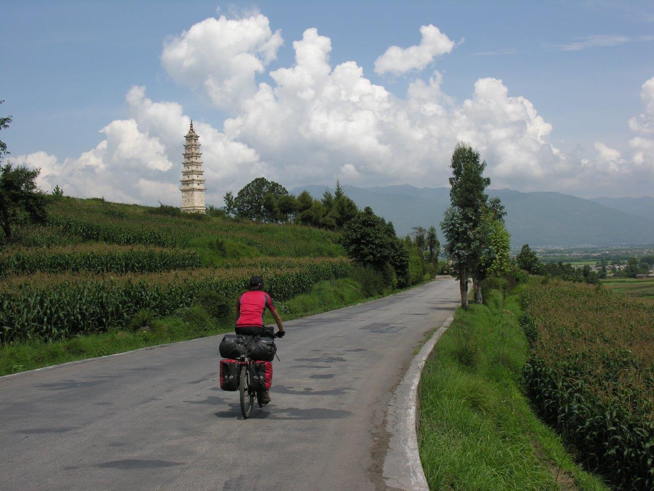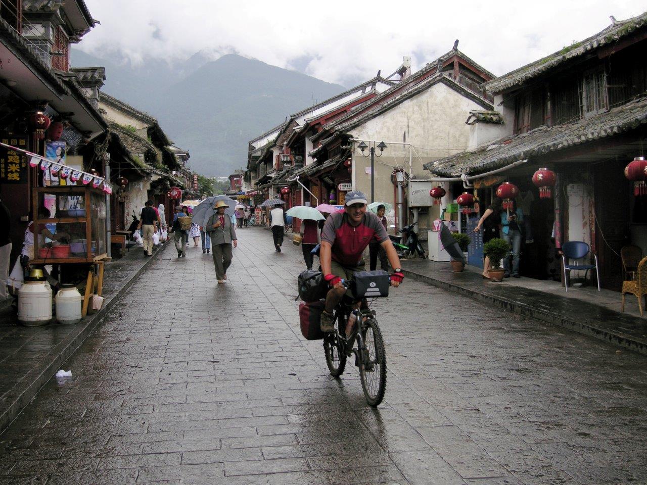Scegliamo di percorrere l’antica strada che collega verso ovest Kunming a Dali, conosciuta come Burma Road in quanto realizzata per le relazioni con la vicina Myanmar, l’ex Birmania. Quando finalmente riusciamo ad allontanarci dalla periferia industriale, ci ritroviamo a pedalare attraverso una zona collinare, sempre intorno ai 2000 m di altitudine, dove i campi di riso si alternano a quelli di tabacco e mais. Dali è stata la capitale di un antico regno sopravvissuto fino all’invasione mongola nel XIII° sec, di cui conserva un bel centro storico con case basse in pietra e legno, alcune splendide pagode e un centro monastico buddista, recentemente ricostruito dopo le distruzioni del periodo della Rivoluzione Culturale. Un po’ demoralizzati dal persistere della pioggia, decidiamo però di non mollare e di proseguire verso la tappa successiva: Lijiang, altra città storica caratterizzata dalla cultura dell’etnia Moxi, ancora oggi estremamente vitale. Siamo impressionati dall’imponente flusso di turisti cinesi che ogni giorno invade le strette viuzze della città vecchia.