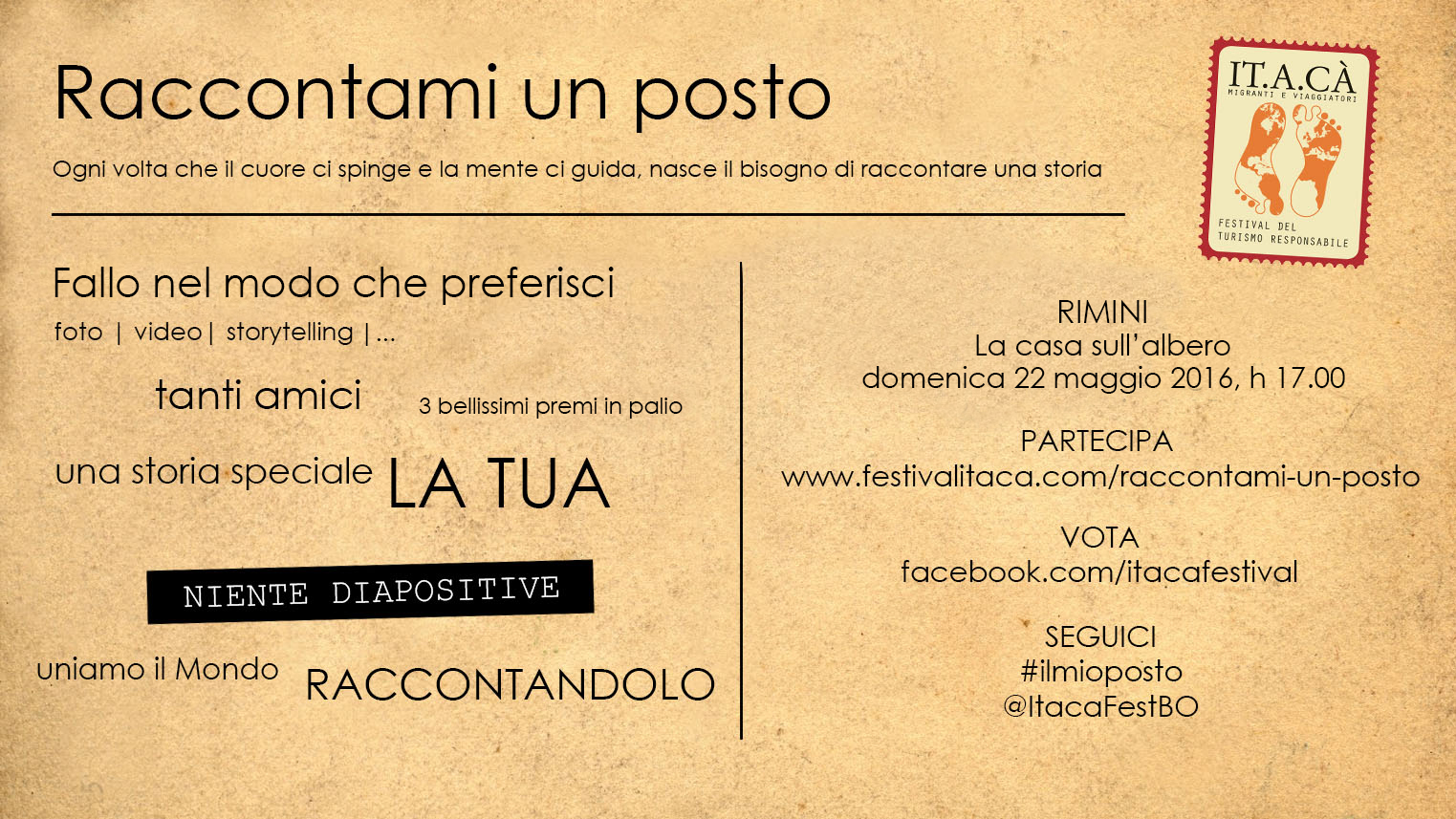 Per questo abbiamo bisogno del tuo aiuto: aiutaci a condividere l’evento con i tuoi amici! Puoi farlo scrivendo a @ItacaFestBO su twitter e instagram e usando #ilmioposto, oppure condividendo questo post o l’evento Facebook che creeremo a breve sui tuoi social network.