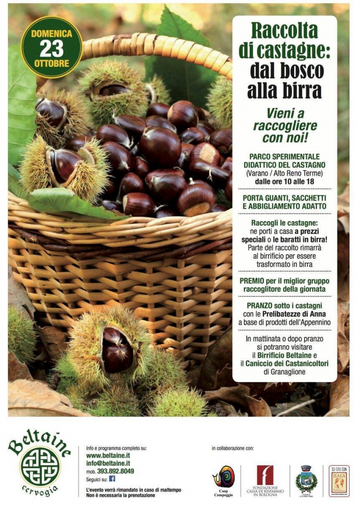 Infine al Parco Didattico Sperimentale del Castagno daremo il via ad una vera e propria raccolta di castagne di gruppo dove invitiamo il pubblico a condividere con noi l’esperienza del raccolto: le castagne del Parco Didattico noi le trasformiamo in birra! I partecipanti, oltre la possibilità di pranzare con prodotti enogastronomici locali, potranno raccogliere le castagne e scegliere se barattarle in birra o portarle a casa a prezzi di auto-raccolta. Siamo sempre più abituati a trovare i prodotti nei mercati, nei negozi e dimentichiamo quanta bellezza ci sia nel raccogliere consapevolmente i prodotti della nostra terra: la raccolta diventa così un’occasione per camminare tra i boschi, stare in mezzo alla natura, ascoltarne i rumori e il silenzio, annusarne gli odori. Mi raccomando se parteciperete, venite con guanti, cestini e abbigliamento adatto.