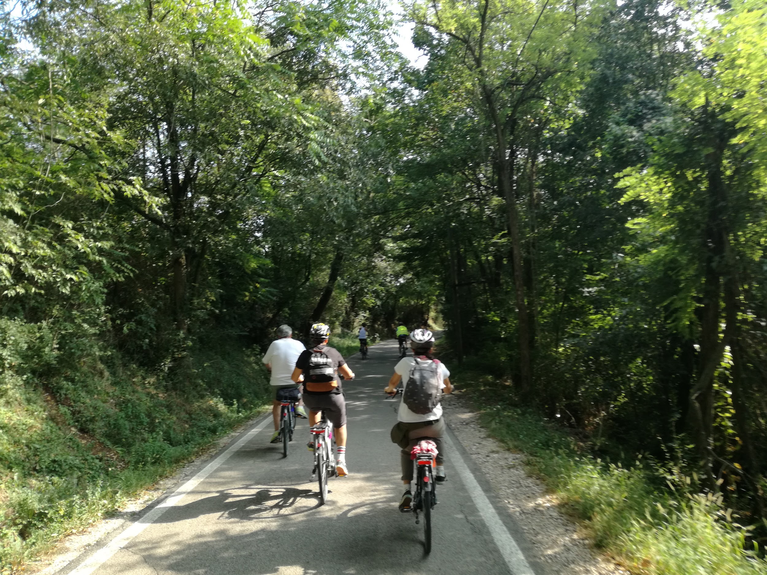 Il punto di incontro è fissato nei pressi di Battaglia Terme. Qui il tour operator Viaggiare Curiosi mette a disposizione le bici, a pedalata assistita così da permettere a tutti, allenati e meno allenati, di poter godere delle bellezze del territorio. Il gruppo numeroso, una volta aver preso dimestichezza coi comandi della e-bike, si appresta a partire e a seguire Giorgio che ci accompagnerà per tutti i 60km dell’anello alla scoperta del patrimonio culturale dei Colli Euganei. Raggiungiamo presto la città murata di Monselice per continuare poi lungo il canale Bisatto.