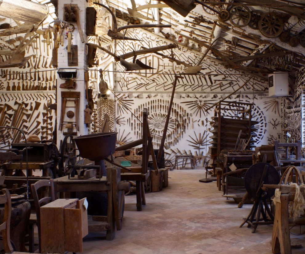 Ecco perché il Museo Ettore Guatelli di Ozzano Taro (PR) merita un’attenzione particolare. Nato dall’idea di un maestro elementare che desiderava omaggiare i lavoratori della campagna, si è evoluto nel corso di cinquant’anni diventando un luogo d’insegnamento per i bambini, sino a configurarsi come uno dei più importanti musei etnografici della civiltà contadina. Qui Guatelli ha raccolto 60000 oggetti di un’epoca in cui la vita quotidiana trascorreva tra impegno costante e grandi fatiche. Triboli, bigonci, setacci, aratri, trapani, torni, pestarole hanno perso la fatica e guadagnato la bellezza, come dicono le guide. Perché il maestro non si è limitato a raccogliere gli oggetti, ma li ha appesi al muro per dare vita a composizioni artistiche uniche nel loro genere. Design spontaneo, lo chiamano, ovvero arte creata con cose umili, ferri vecchi che oggi butteremmo senza pensarci due volte. Ma è proprio qui che si esprime tutta la potenza pedagogica del Museo.