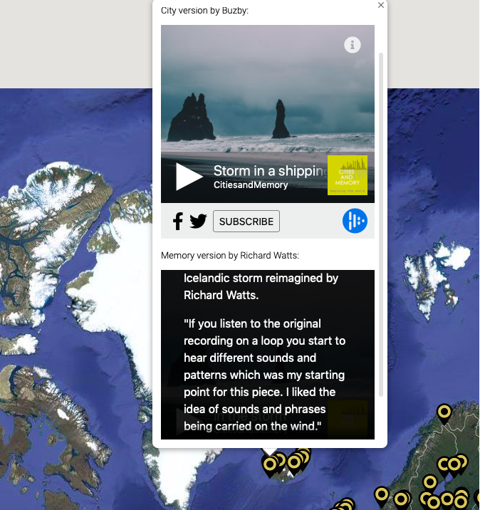 Strutturata in modo simile vi consigliamo anche un’altra piattaforma dal contenuto ancora più poetico e suggestivo. Basandosi sul concetto di memoria e delle impressioni che rimangono dopo aver visitato un luogo, la mappa del Progetto Cities and Memories raccoglie i suoni registrati dagli utenti in un dato posto e li accoppia a una successiva rivisitazione artistica da parte di altri utenti che non ci sono mai stati ma che decidono di provare a rielaborarne le sonorità catturandone l’essenza.