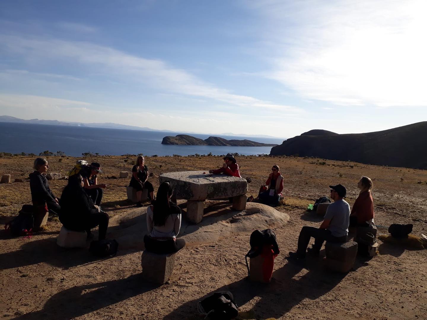 Gruppo di esploratori in preghiera: “Templo del sol”. Lago Titicaca Bolivia, Isola del Sol.
