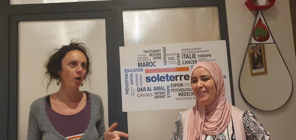 Abbiamo potuto conoscere e visitare la Casa di Accoglienza di bambini oncologici di Marrakech, la Casa «Dar Amal» (Casa della Speranza) grazie a Soleterre Onlus, l’Ong italiana che opera da più di 10 anni in diversi paesi del mondo con un programma salute a sostegno dei pazienti oncologici, con particolare attenzione ai bambini. Qui, abbiamo incontrato Sonia Drioli, responsabile locale di Soleterre, e Bahija Gouimi, presidentessa della’associazione locale Amal e docente di Economia all’Università di Marrakech.
