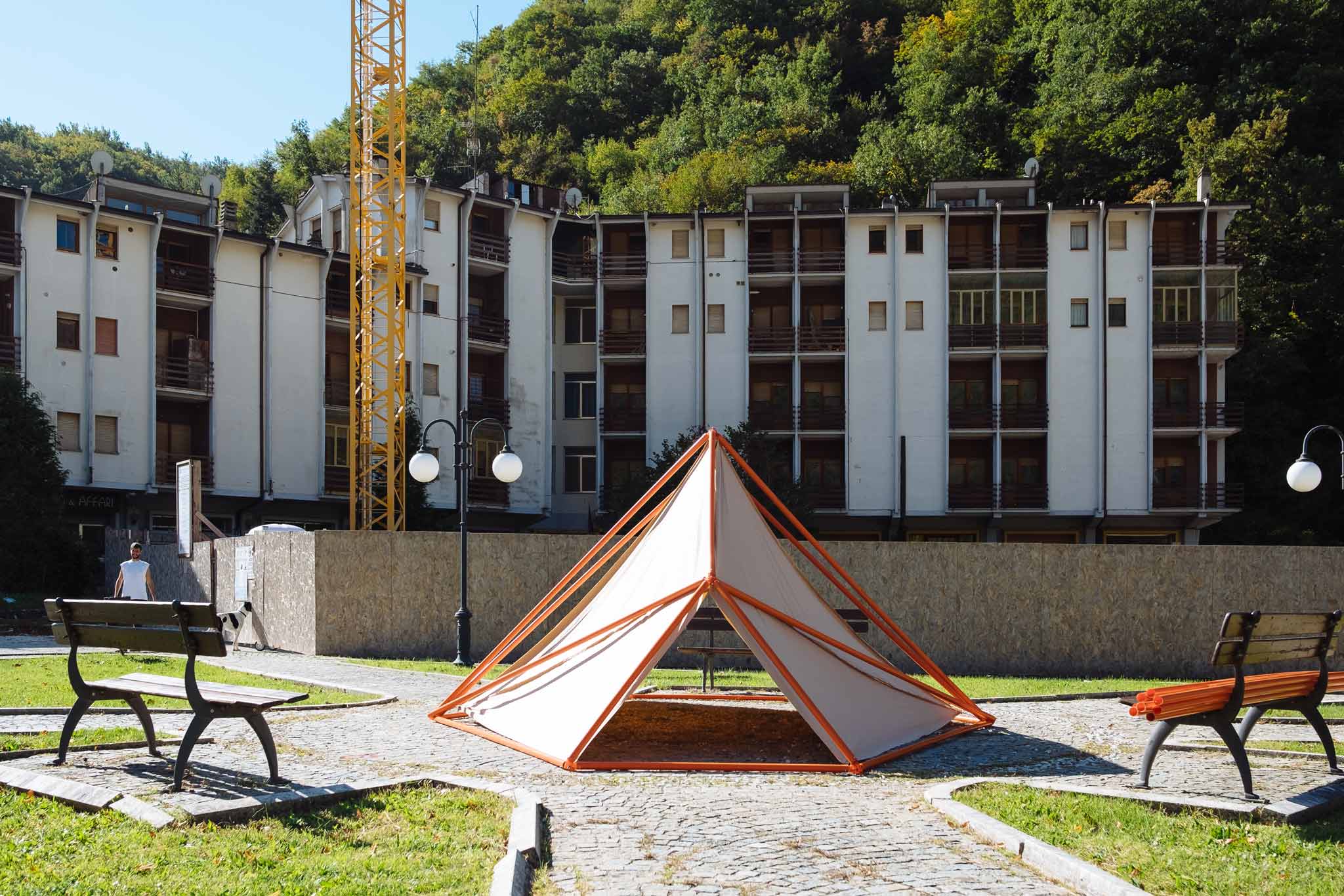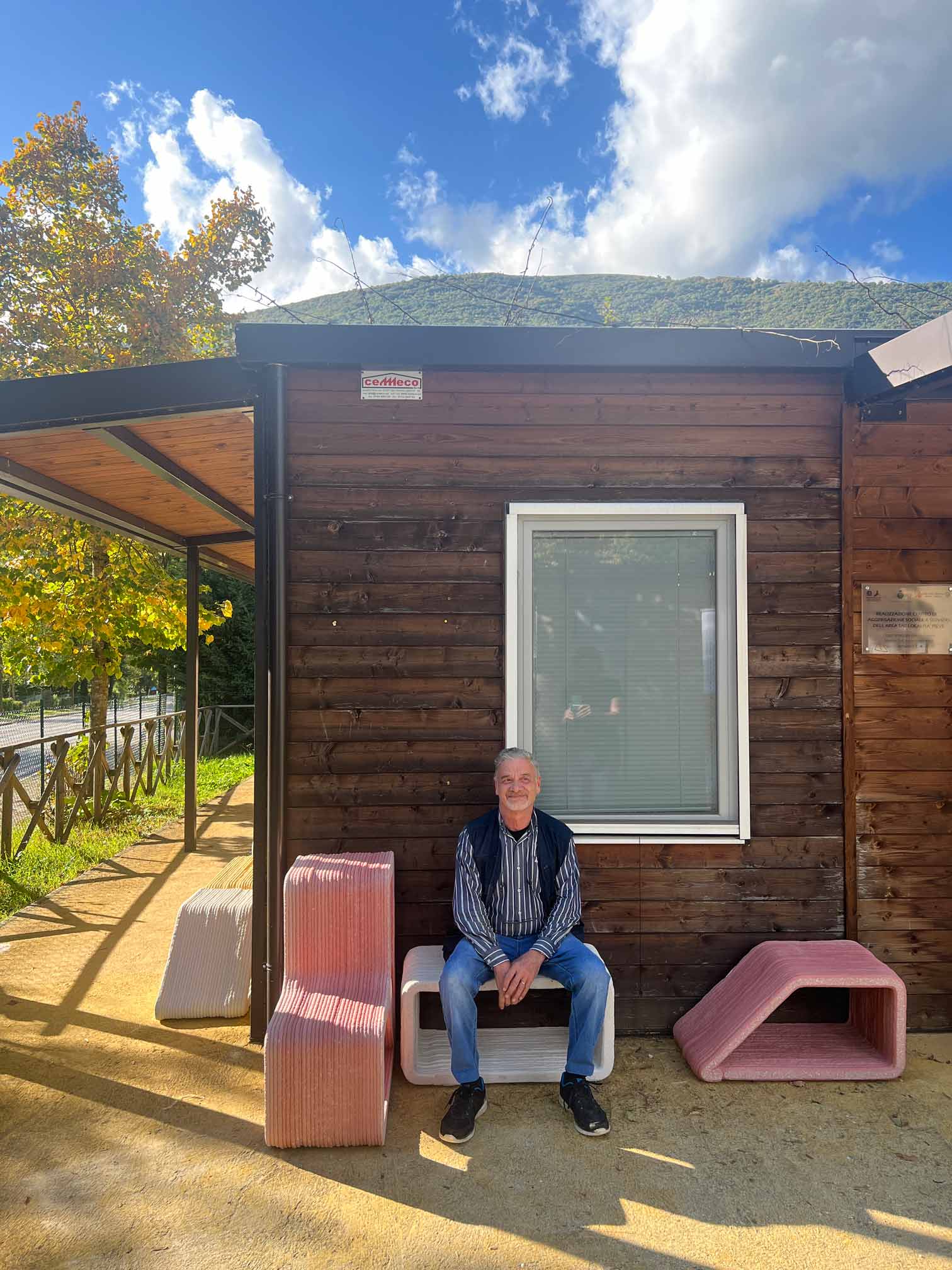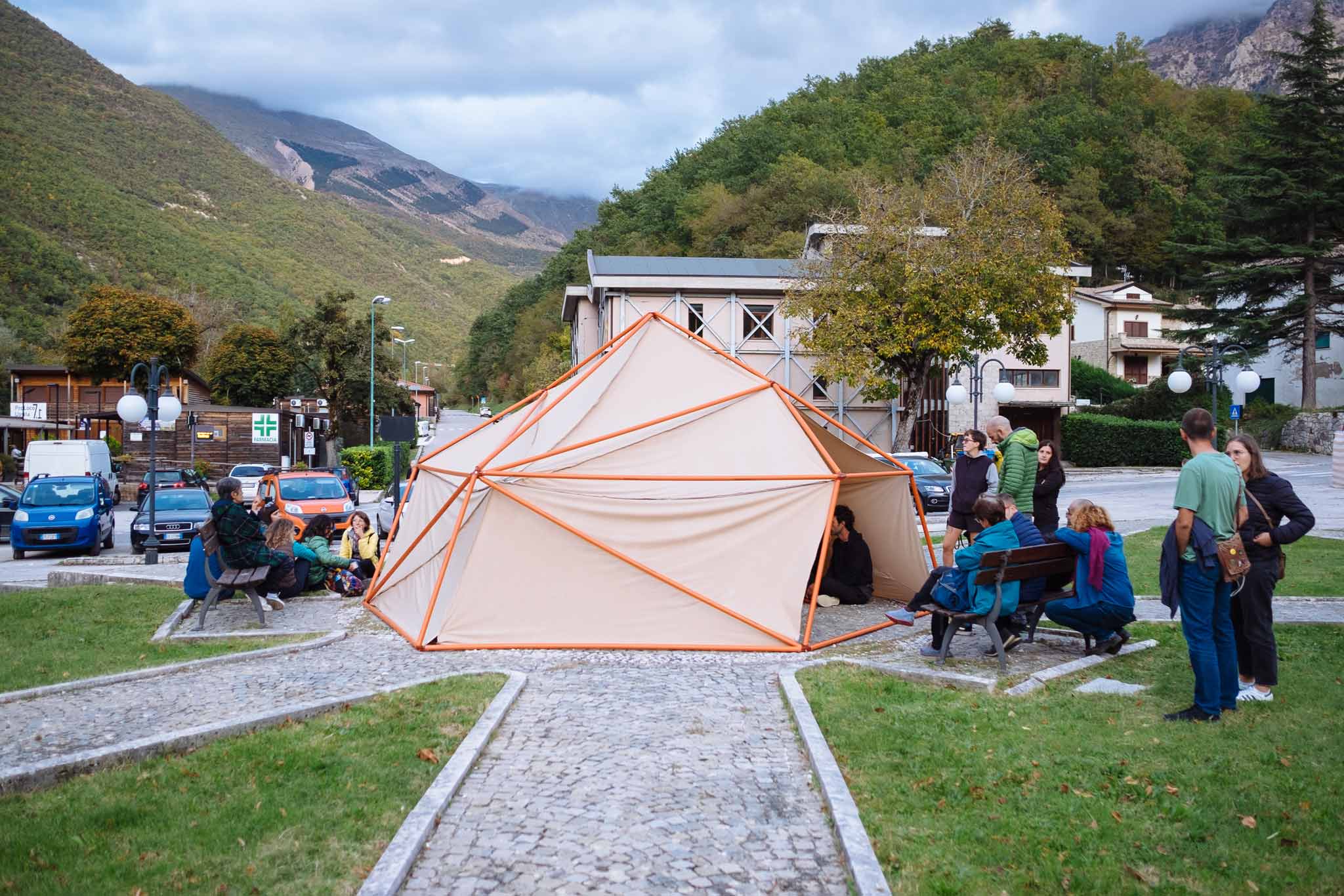 Sempre con le mani, a Ussita abbiamo costruito Nomadie, una struttura autoportante di Lorenzo Malloni che indaga la crisi dell’abitare e abbiamo posato le sedute di arredo urbano in cemento realizzate da Centauroos (startup di architetti che lavora nel cratere sismico), fatte tramite stampante 3d con una parte delle macerie del sisma e che a C.A.S.A. sono state donate. Dalle sedute ci siamo alzati e abbiamo applaudito al ritmo della musica delle Travel songs di Emiliano Battistini e delle storie narrate con organetto, chitarra e percussioni da Chiara Cerri tratte dal suo libro “Sulla faglia”.