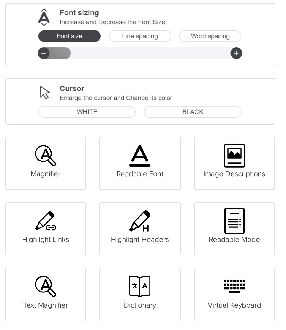 Le principali funzioni adottate vanno dal lettore di testo, alla regolazione del colore, regolazione del contenuto, regolazione del cursore, collegamenti e intestazioni di evidenziazione, lente di ingrandimento, carattere leggibile, descrizioni delle immagini, ecc.